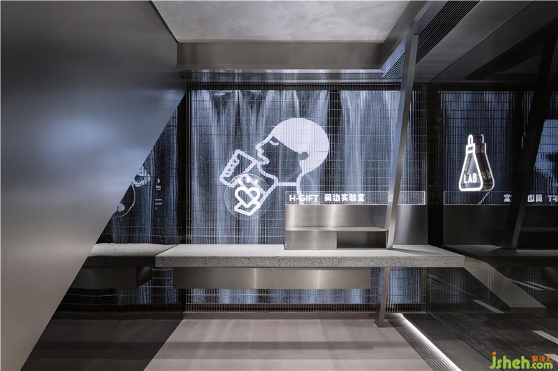 周邊實(shí)驗(yàn)室位于入口處,承接著外立面LED電子墻面上的詩(shī)意影像動(dòng)態(tài),結(jié)合了金屬格柵的線條美感,與多元周邊產(chǎn)品的陳列關(guān)系和融一致。