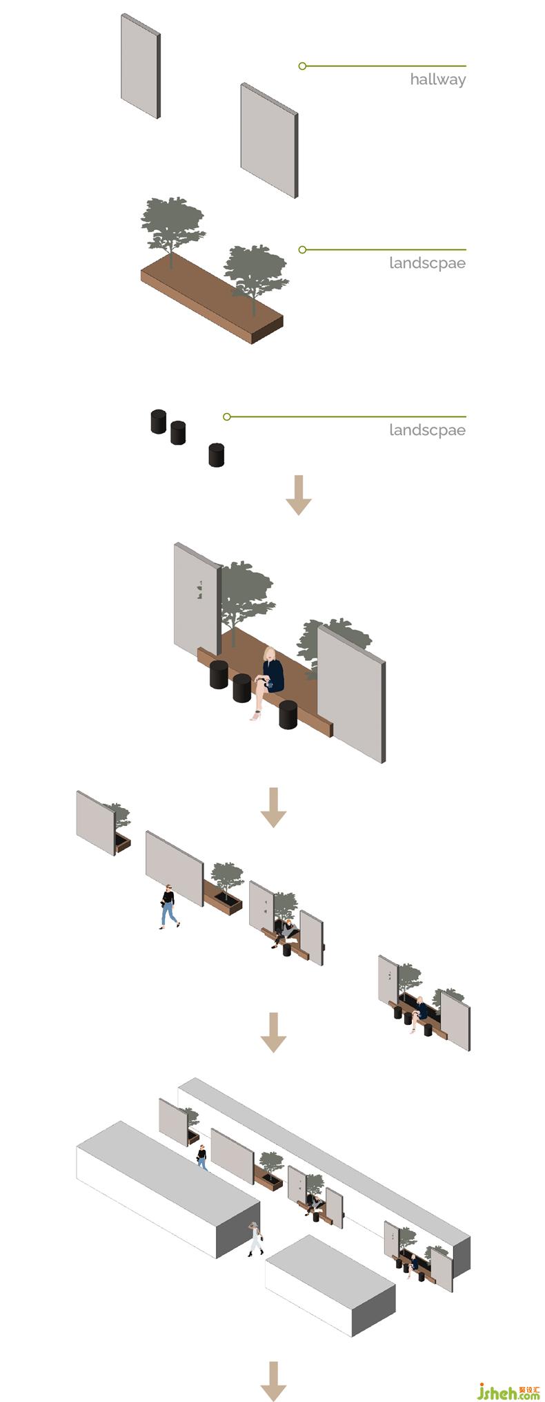 設(shè)計師希望在此模糊空間場所的屬性,依托空間所產(chǎn)生的交互的,空間即是產(chǎn)生未知的場所,當(dāng)空間具備情緒,人會有更高級的體驗(yàn)。設(shè)計師借鑒園林造景的手法,在室內(nèi)營造小處景觀,消弭公共空間的視覺和心理邊界,讓室內(nèi)外的美好并存,在藝術(shù)感知、思維沉浸、靈感綻放的過程中,激發(fā)使用者與空間的無限互動