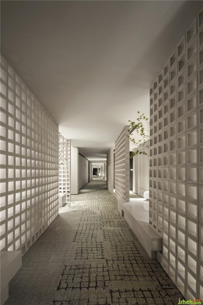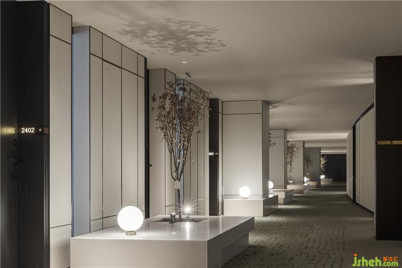 客房過道區(qū)域,設(shè)計師大膽地提出客房內(nèi)退的形式,犧牲客房的空間,以迂回式的入門儀式,通過門口的景觀、屏風(fēng),不同組合方式圍合出獨(dú)立小庭院,與外界隔絕,構(gòu)成廊道街區(qū)效果,制造美好的體驗(yàn)感與私密性