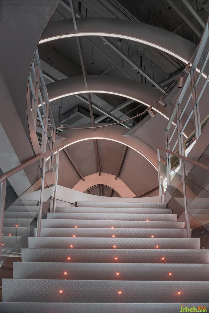 向上,配有呼吸燈裝置的鋼構(gòu)樓梯,閃爍著迷幻的紅光,潮玩設(shè)計指引著旅程。