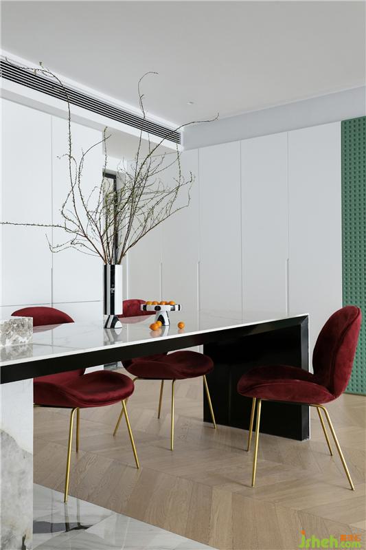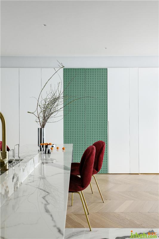 房子的日常是主人生活方式的呈現(xiàn),是一個(gè)家庭生活態(tài)度和審美取向的展示。在餐廳、廚房的設(shè)計(jì)上,我們?nèi)≈匀?,用之自然,也愛之自然,用綠色點(diǎn)綴空間,加入植物的嵌入,整體空間給予人安寧的體驗(yàn)感,讓居者回到本性中的寧?kù)o清澈。
