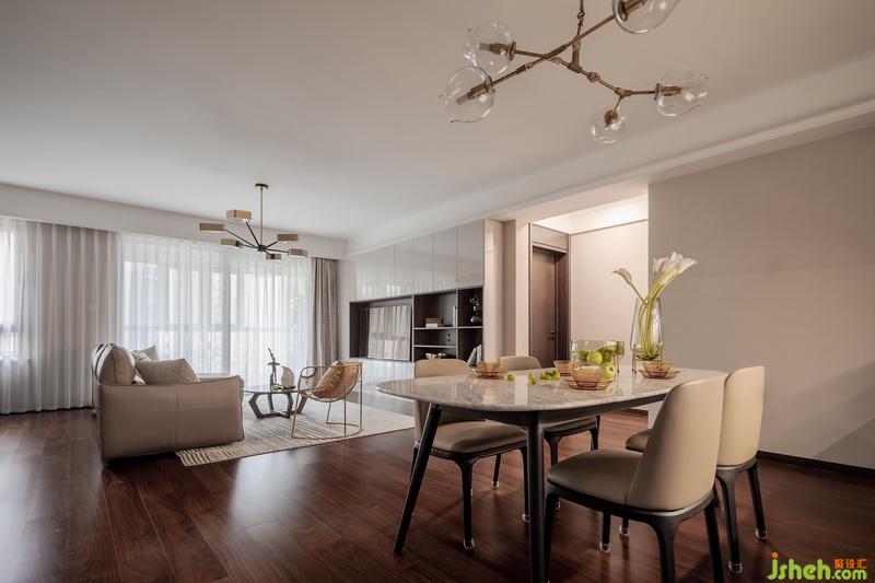 根據(jù)功能需要設(shè)計(jì)師將櫥柜設(shè)立為上下兩層,上柜的高度使得頂端與天花板之間產(chǎn)生“留白”的效果,減少其壓迫感。