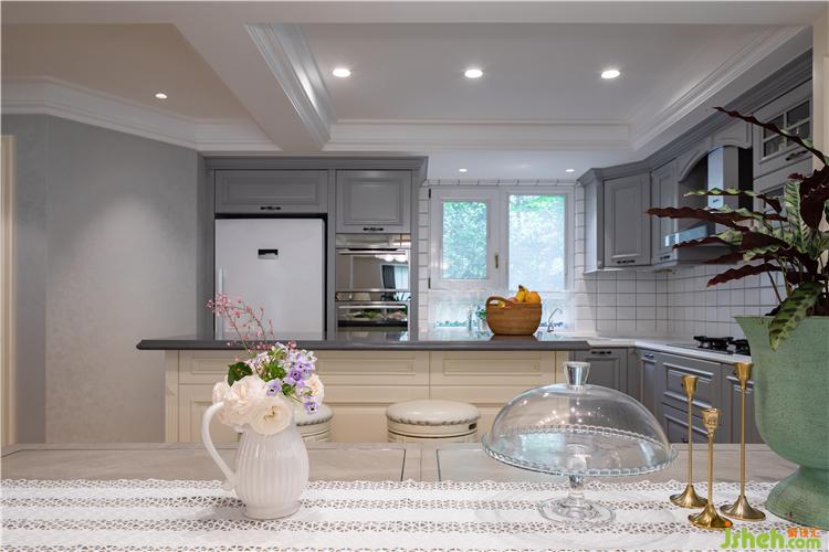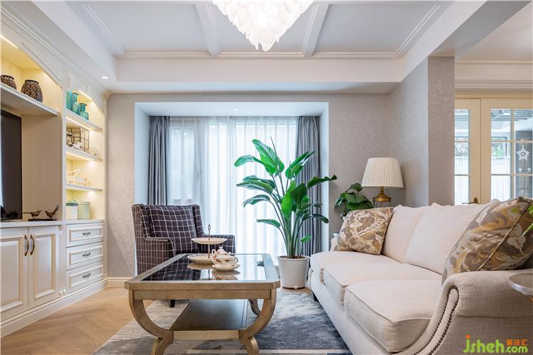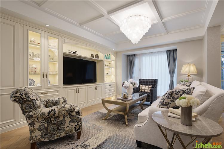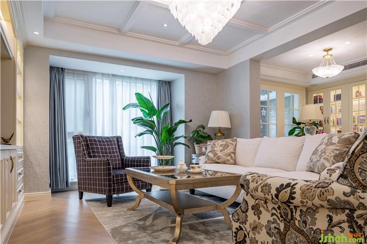 客廳采用嵌入式石膏吊頂,搭配精致的吊燈,復古造型的組合沙發(fā),讓現代美式風格得以進一步的彰顯。