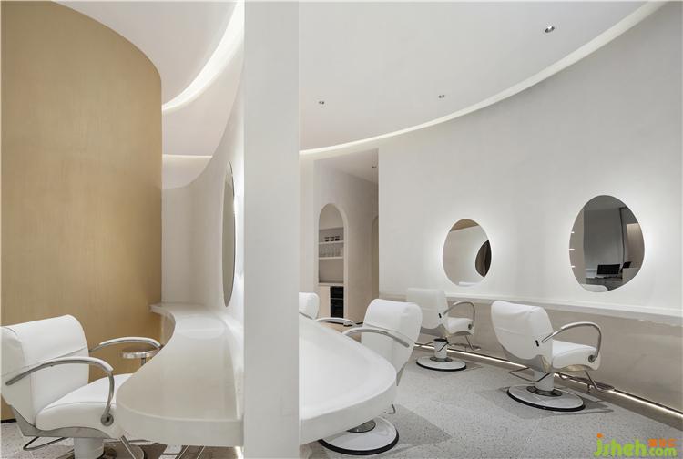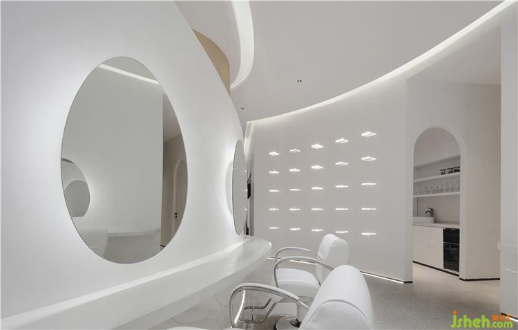從接待區(qū)步入產(chǎn)品展示區(qū)、理發(fā)區(qū),無(wú)論是理發(fā)臺(tái)、鏡面、地面的線性燈都是由若干個(gè)不同的曲線與圓表達(dá)這個(gè)空間,具有強(qiáng)烈的視覺(jué)沖擊力和畫面張力。