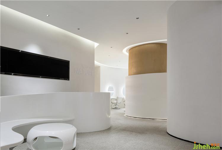 在接待區(qū)之后,是設(shè)計(jì)師特別設(shè)計(jì)出的用以展示各類美發(fā)用品的開(kāi)放式陳列空間,為我們塑造出科技感十足的空間。