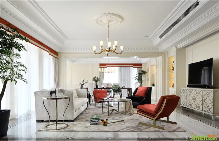 寬敞的起居室由米白色的墻板包層,同時(shí)還有一些定制的展示柜,將跳躍的橙色單椅、淺灰地毯以及干凈的白色布藝融合在一起。一旁的餐廳里,深色的胡桃木桌和布藝餐桌凳使得餐廳看上去高雅而干凈,加上做舊而狹長(zhǎng)的吊燈點(diǎn)綴,更顯得別致。別墅裝飾
