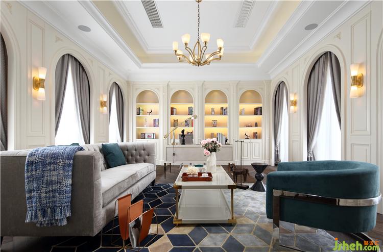 為第二代人打造出寬敞的會(huì)客閱讀和睡眠空間,兩面落地的窗戶有一個(gè)很好的視覺通透感,延伸到不同區(qū)域抑或是戶外景觀,在這樣下,陽(yáng)光也忍不住偷偷溜進(jìn)來(lái)瞅一眼。兩面分割的圓弧形的窗戶預(yù)留出的窗簾盒子,形成了一處兩面看景呼吸,別致的古典手法打造的景觀分割。這里是關(guān)于藍(lán)色的溫度,漸變的灰藍(lán)色主題地毯是整體空間基調(diào)的延伸,而點(diǎn)綴的藍(lán)色、墨綠的軟裝陳設(shè)則與灰度相當(dāng)?shù)拇竺娣e空間形成強(qiáng)烈對(duì)比。別墅裝飾