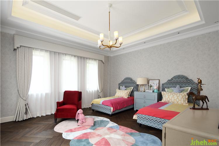 為了給孩子們提供一處充滿童趣的空間,我們挑選了兩張頗有幾何趣味的床體和一張鮮紅的沙發(fā),包括異形地毯的定制,顏色都是由孩子們最喜歡的愛麗絲夢(mèng)境的主要色彩組成。