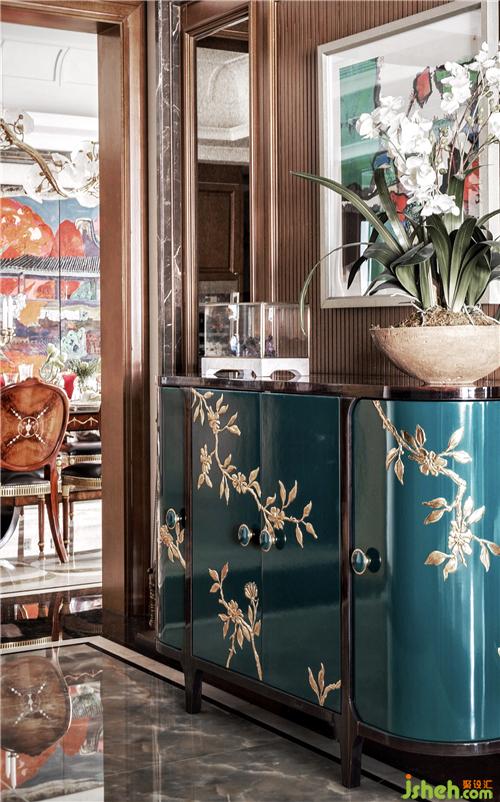 餐廳與客廳間有一個(gè)過廳,豪宅裝修設(shè)計(jì)特意設(shè)計(jì)成了一個(gè)茶室,茶室的對(duì)面正好對(duì)著江景,女主人可以在這里和閨蜜們喝一杯下午茶,相當(dāng)于是一個(gè)小型會(huì)客廳。女主人喜歡收藏杯碟,在過廳靠墻的位置上放置著一張精致的酒柜,正好可以收納這么多年來女主人的收藏,為下午茶增添一份儀式感。