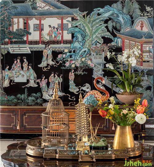 對(duì)于客廳的穩(wěn)重大氣,文化的元素要得以呈現(xiàn),于是針對(duì)墻壁的掛畫室內(nèi)設(shè)計(jì)師特意找藝術(shù)家定制了一幅中式傳統(tǒng)漆畫,在漆畫的內(nèi)容上使用了中國傳統(tǒng)的工筆畫法表現(xiàn),力求場景的豐富度、中西方文化的交融的感覺。