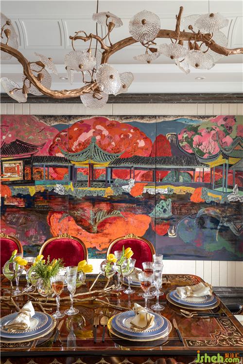 同樣在餐廳的設(shè)計(jì)中,豪宅裝修設(shè)計(jì)也選擇了一幅漆畫,但是另行其道,使用了一些當(dāng)代油畫的畫法,用整體的色彩感和意境美的表達(dá)呈現(xiàn)出當(dāng)代元素,濃烈的色彩感與餐廳的會(huì)客氛圍和食欲遙相呼應(yīng)。精致的燈具在餐廳中的布置也是點(diǎn)睛之筆。