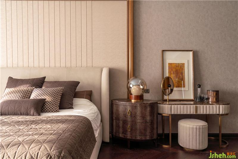 針對主臥的設(shè)計,豪宅裝修設(shè)計來了個反轉(zhuǎn),沒有延續(xù)外面客廳或餐廳的那種濃烈感,女主人希望自己的家整體還是呈現(xiàn)多元化,燈具造型和地毯的幾何紋理讓主臥營造出一種意大利的簡約輕奢風(fēng)。女主人和男主人的生活,有需要每日親手打理、那些淳樸自然的部分,也有科技簡化了日常的部分。傳統(tǒng)繁瑣與現(xiàn)代智能簡便,兩種生活狀態(tài)融合于家中,映襯出夫婦倆各異的性格與其平衡。