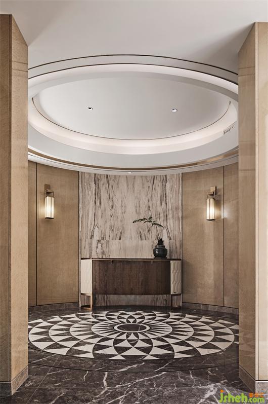 門廳融合東方禮儀,抬眸俯首皆為“圓”的運(yùn)用,容納迎來送往的親朋好友。中軸對稱布局,將不同形態(tài)的“圓”演繹得更加豐滿,呈現(xiàn)兼具趣味與變化的視覺效果。