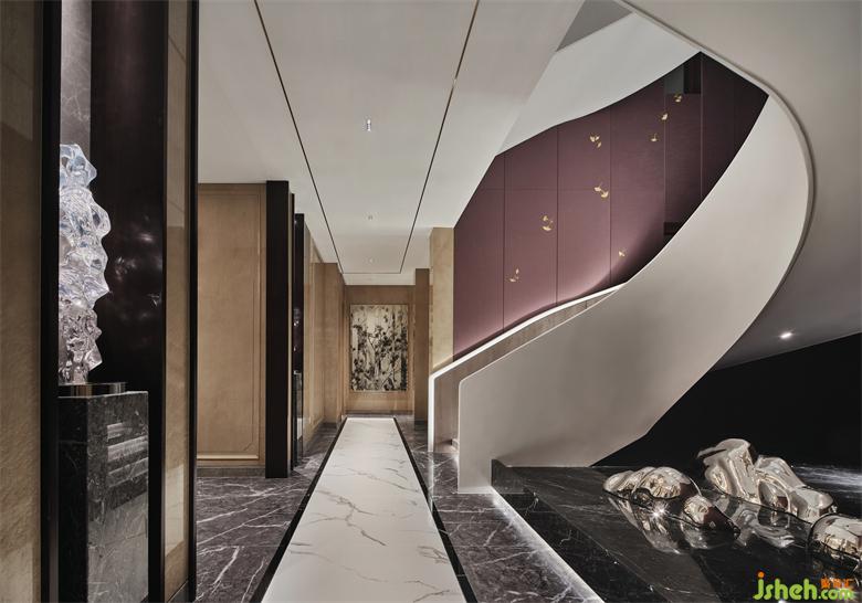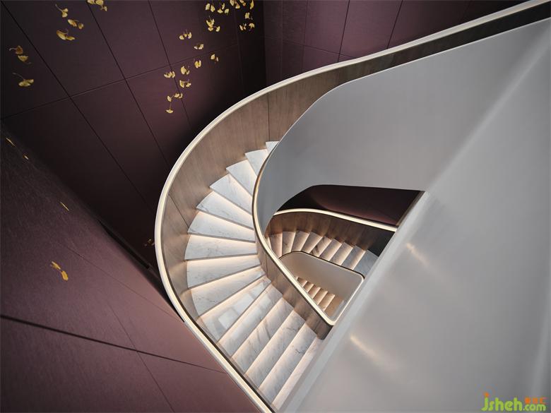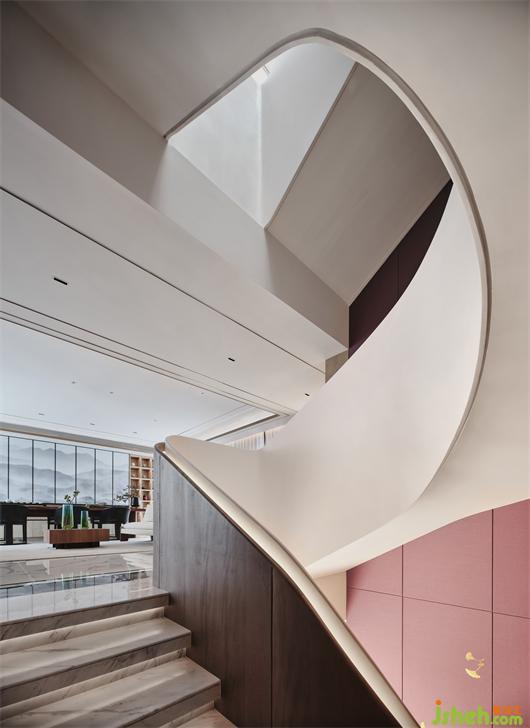 從負(fù)二旋轉(zhuǎn)至頂樓的樓梯是連接上下功能的重要裝置,也是展示空間藝術(shù)的主要元素。木飾面包裹大理石,在隱藏?zé)魩У狞c(diǎn)襯下格外溫馨,每走一步都是強(qiáng)烈的儀式感。