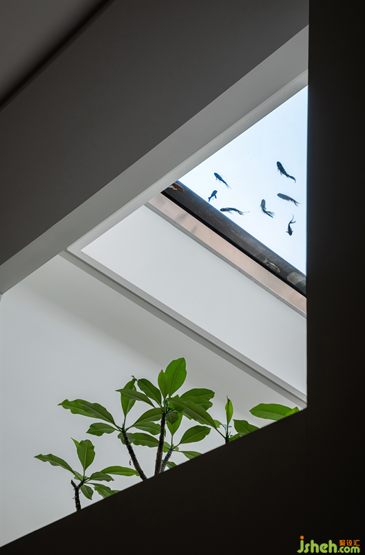 魚和樹兩者奇妙的共處一室,抬頭望去與眼前水天一色的景致相互映襯,美得令人窒息,立于天井下,有如沉浸在水底般的祥和寧靜。