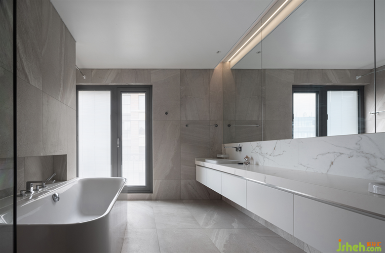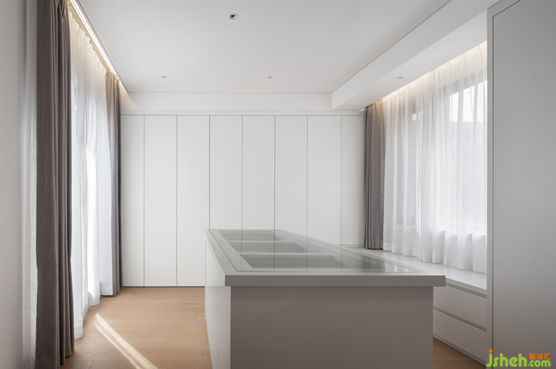 干練、明亮、留白,方寸之間盡情展現(xiàn)著女主人對(duì)衣帽區(qū)域的考究姿態(tài)。盥洗區(qū)域隱形儲(chǔ)藏柜,嵌入墻面,使墻與柜完美融為一體,既提供展示與收納,又將空間統(tǒng)一起來,克制而整潔。