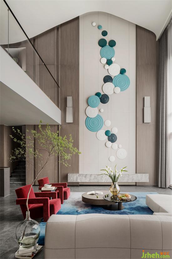 為發(fā)揮建筑的最大價(jià)值,確定整體架構(gòu)是重要的一步。延續(xù)房屋本體的層高優(yōu)勢(shì),我們采用波形頂面的挑空設(shè)計(jì),令簡(jiǎn)單、明快的造型結(jié)構(gòu)拉近人與空間的距離感。背景墻以3:2比例分割,不別墅設(shè)計(jì)同材質(zhì)拼接的處理方式將層高近6.5m的大空間收攏住,不讓挑空格局顯得過于空曠,也令客廳更具視焦點(diǎn)。