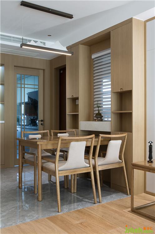 窗戶兩側(cè)做成餐邊柜形態(tài),節(jié)省空間,并利用窗戶光線引入用餐區(qū)域。