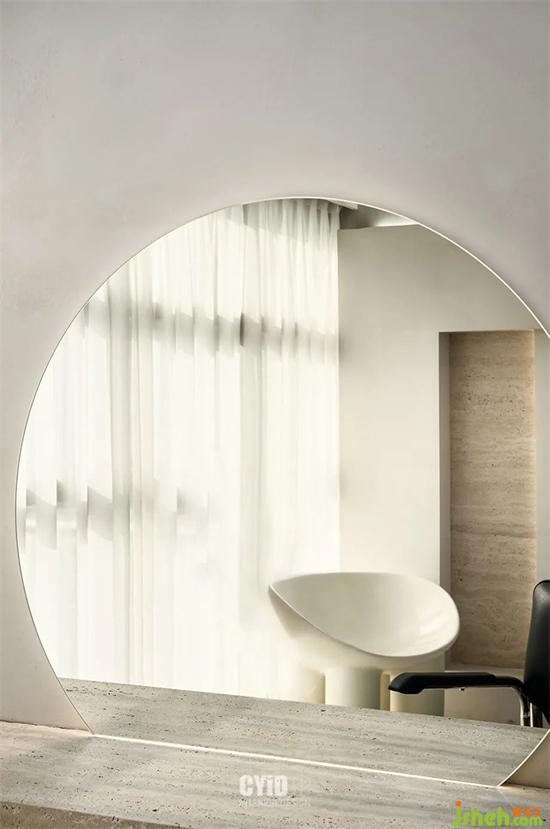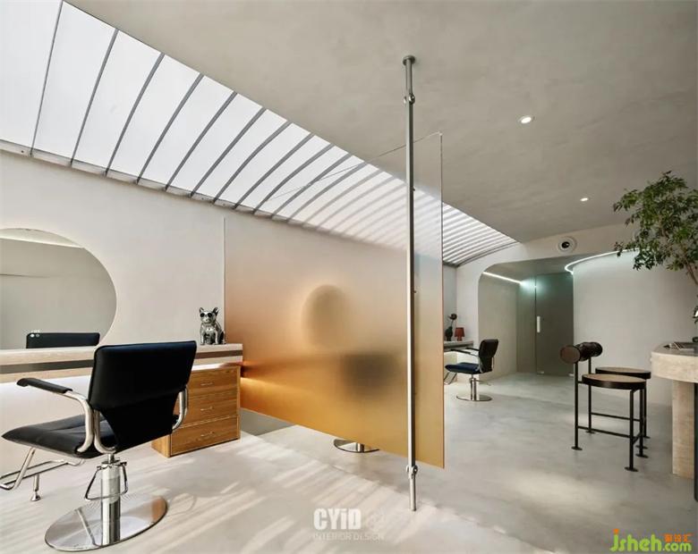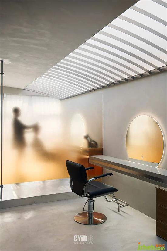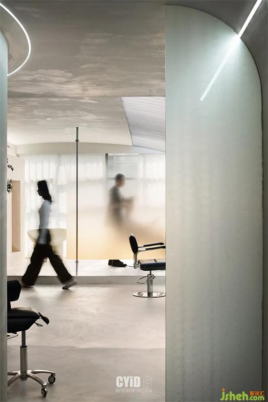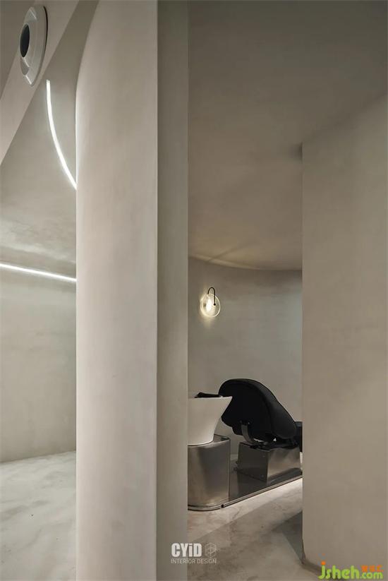 在有限的空間里用弧形劃分出一個(gè)洗發(fā)區(qū),既提打破了空間的呆板,也提升了顧客洗發(fā)時(shí)的私密感,與此同時(shí)更是營(yíng)造了一個(gè)包裹性比較強(qiáng)的進(jìn)門體驗(yàn)感,傳達(dá)視覺空間的柔和與商業(yè)店鋪設(shè)計(jì)純粹。