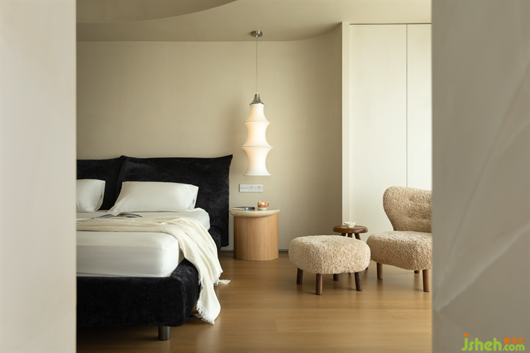 (主臥)將生活方式塑造成獨(dú)有的形態(tài),線條和幾何結(jié)構(gòu)簡而清晰,弧線讓氛圍圓融聚合,呈現(xiàn)出舒適的包裹感,婉約自然,不盡回響。而留白的語境里,想象在空間中肆意生長。在日復(fù)一日里,承載著平淡卻綿延的情感。