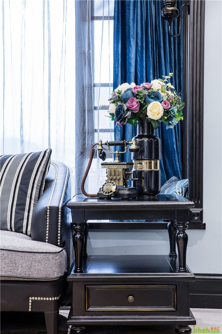 一間有窗的房子就像一間有風(fēng)景的家,而這個(gè)戶型客廳位置有著巨大的飄窗,外面的風(fēng)景被投射進(jìn)來(lái),投射在室內(nèi)的每一面墻上。先有距離,然后有了光,從窗戶影射進(jìn)來(lái)的陽(yáng)光打在人字拼的木地板上,讓這個(gè)暗黑風(fēng)格的室內(nèi)環(huán)境充滿一絲絲溫潤(rùn)。萊茵藍(lán)的墻面漆與黑色的木飾面,人字拼的木地板與平行的六角磚相結(jié)合不僅打破固有的氛圍,光線通過折射迅速充盈整個(gè)空間形成鮮明的對(duì)比。