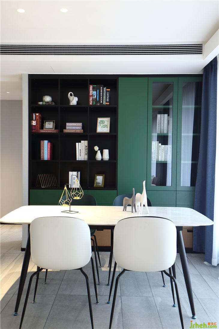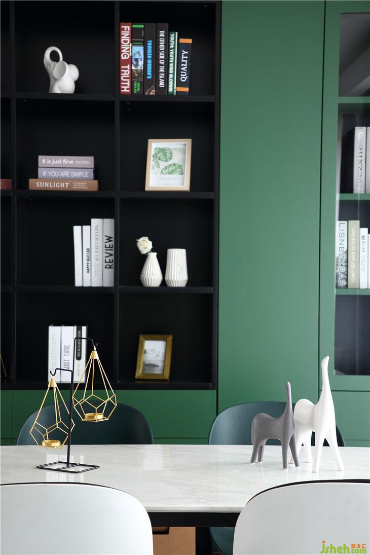 業(yè)主作為85后的年輕父母,依然童心未眠,喜歡色彩艷麗的北歐。最終選取了墨綠色作為主體色調(diào)。設(shè)計(jì)師采用灰色和黑色進(jìn)行了調(diào)和,讓綠色在居住空間中更顯得溫潤(rùn)地得以呈現(xiàn)。
