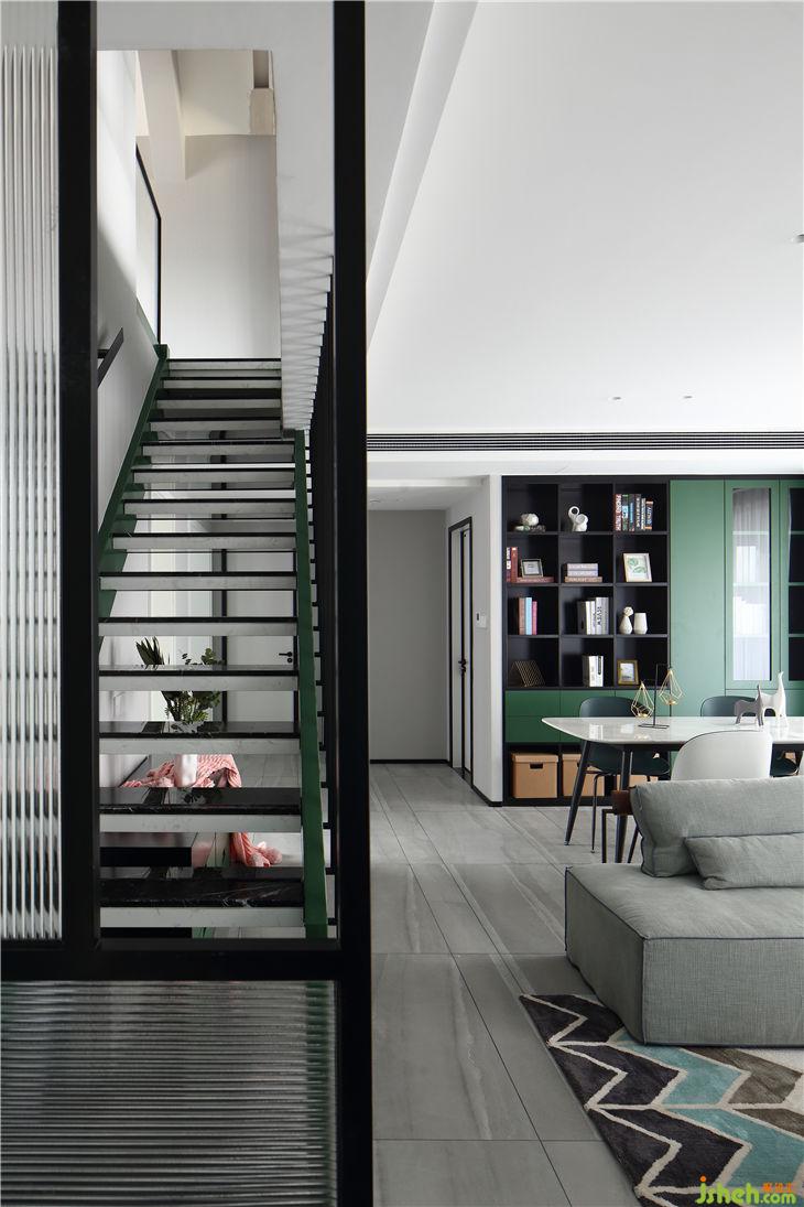 墨綠色鋼結(jié)構(gòu)的樓梯采用鏤空設(shè)計(jì),外掛的欄桿讓原結(jié)構(gòu)只有700mm的樓梯不顯得擁擠。