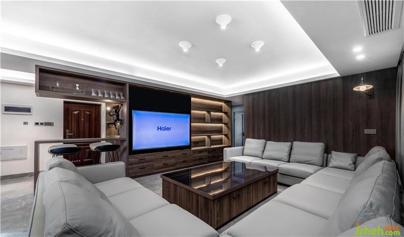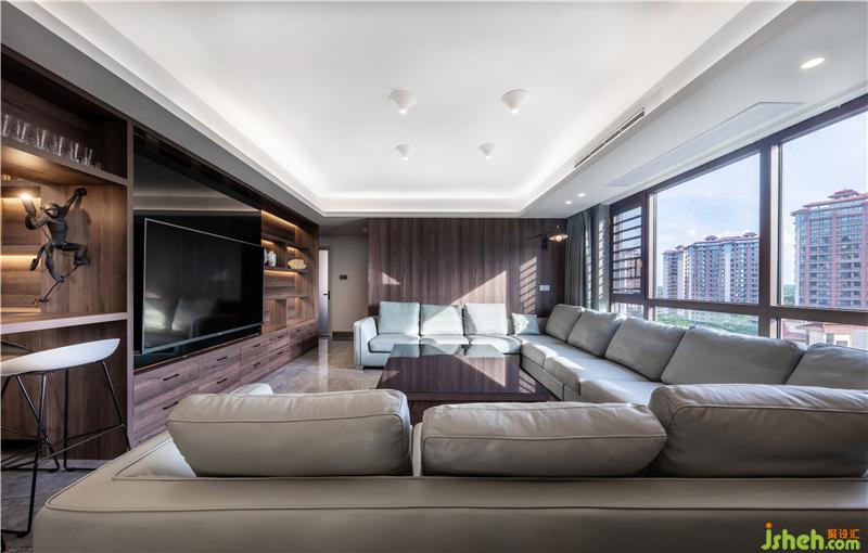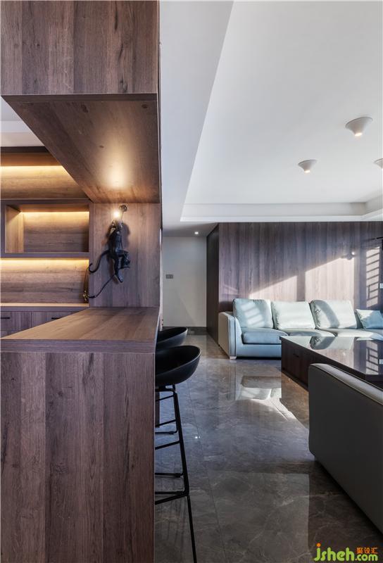 該作品公共空間以客廳作為第一線,入門處充分考慮了國人隱私習(xí)慣,以一道集酒柜、吧臺(tái)、電視柜、儲(chǔ)物柜一體的高檔實(shí)木家具進(jìn)行空間切割,產(chǎn)生更好的空間延伸感。