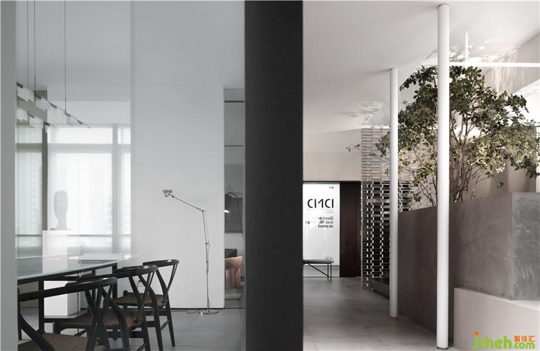 開門見境,玄關(guān)造景,以“樹”塑造空間安靜的氛圍,玻璃磚墻后引介光與影。