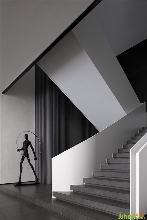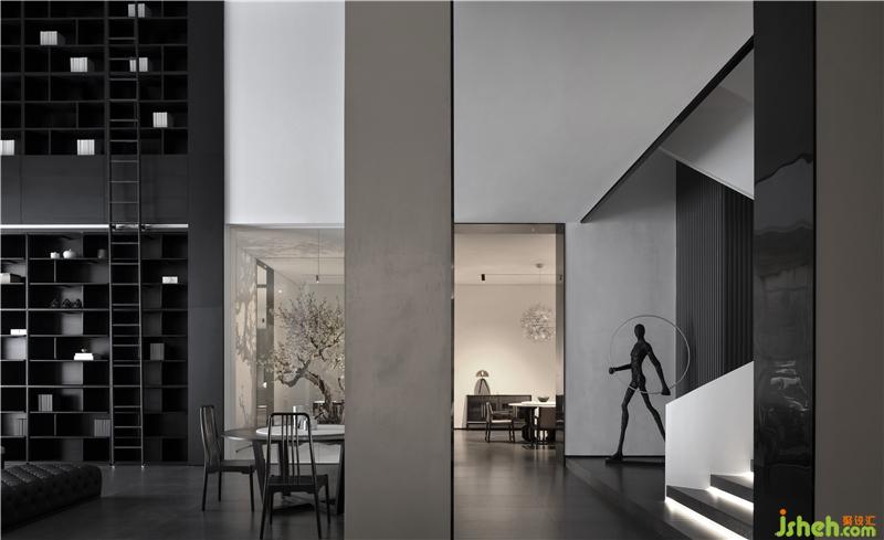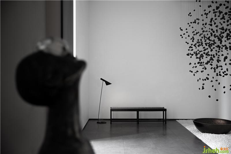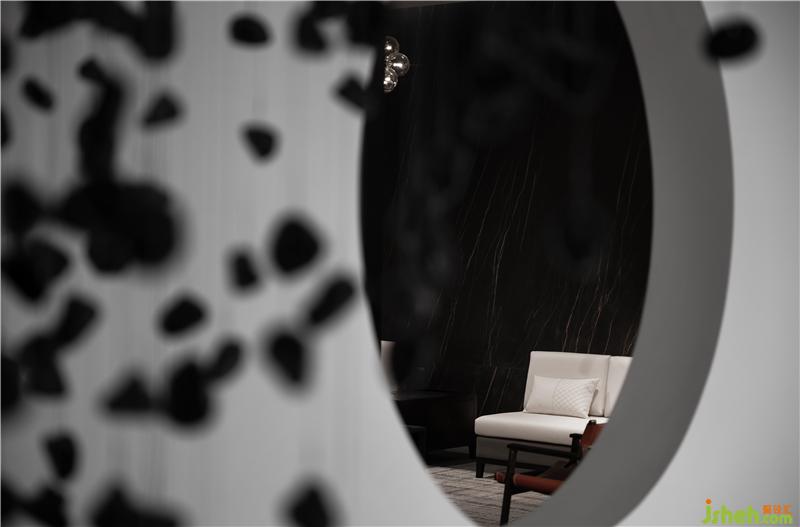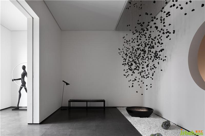 從前廳進(jìn)入玄關(guān),造景與造境,無數(shù)黑色石子從天而降,回歸于一圓盤,寓意“萬物歸一”,順著動(dòng)線的引導(dǎo),進(jìn)入產(chǎn)品體驗(yàn)空間后,體驗(yàn)者藉由移動(dòng)、視野、猜想,與空間產(chǎn)生互動(dòng)能量。重新以美學(xué)的展現(xiàn)存在于空間序列之中,構(gòu)建起純粹且順應(yīng)建筑優(yōu)勢(shì)的室內(nèi)空間邏輯。