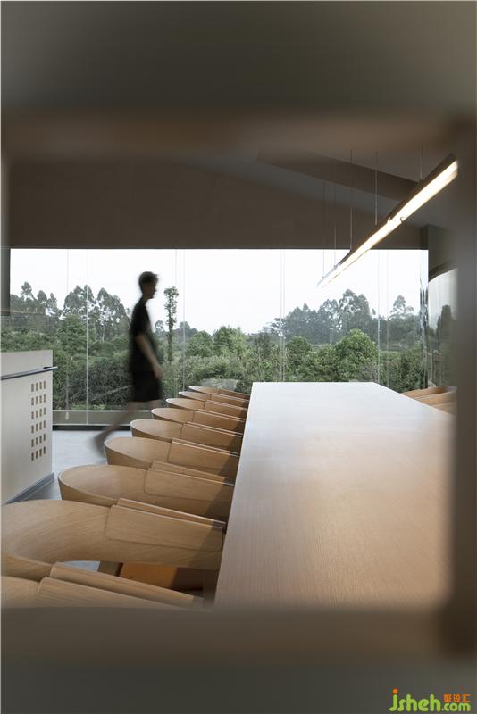 如夢似幻,建筑大面積的玻璃幕墻協(xié)同空間內(nèi)外,將“山林、茶園、竹?!钡木爸潞翢o遮擋地納進(jìn),令建筑視野蔚為壯觀。