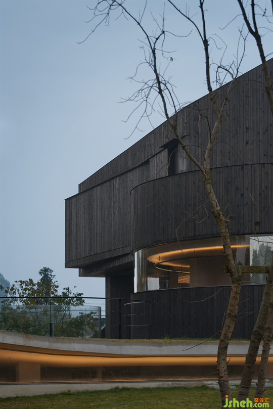 每到夜晚,燈光與夜星輝映,豐富了立面的視覺(jué)效果。立面材質(zhì)采用本地木材廠(chǎng)加工后的杉木板進(jìn)行碳化后安裝。整體黑灰色立面的體感,讓建筑更加低調(diào)內(nèi)斂,同時(shí)也充斥著一絲肅穆的神秘感。