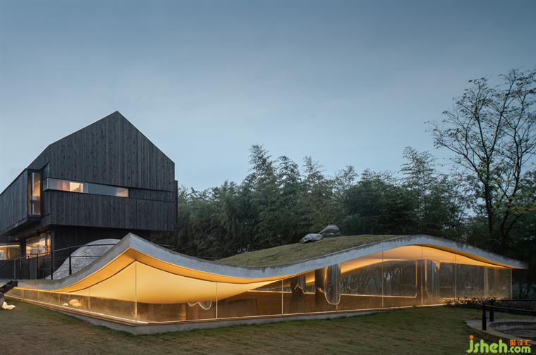 貼地的玻璃幕墻映照出周?chē)闹褡拥茸匀痪坝^。覆土的酒窖間于鄉(xiāng)野與山林,一旁的建筑則映襯著山村和茶田,守護(hù)山野的恬靜與安詳。簡(jiǎn)約而充滿(mǎn)現(xiàn)代感的覆土設(shè)計(jì)與玻璃幕墻,讓其主體呈現(xiàn)自身獨(dú)特形態(tài)。