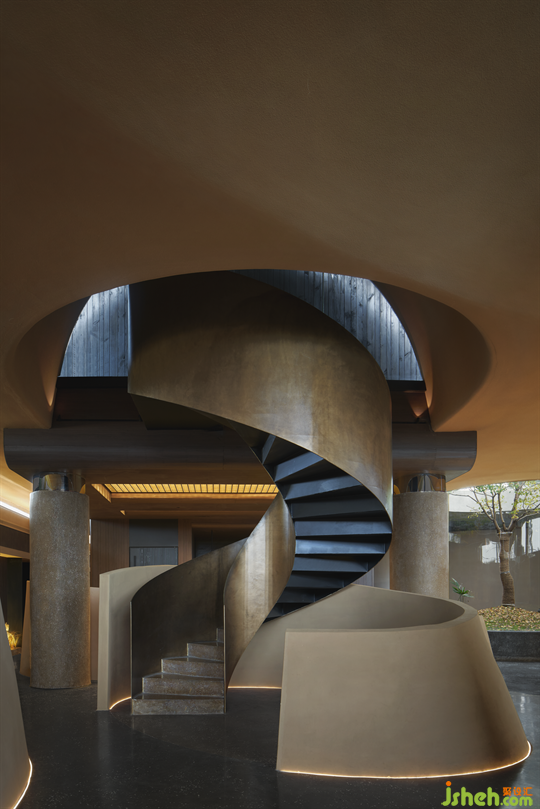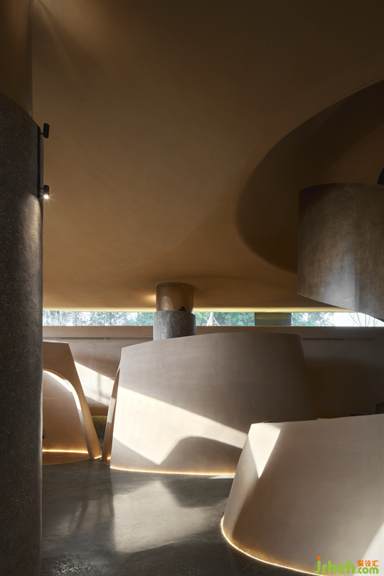 室內(nèi)空間采用雙曲面以及土黃粗砂涂料,由傳統(tǒng)陶土酒壇的形態(tài)與材質(zhì)得來(lái)靈感。用弧線(xiàn)拉開(kāi)格局,用層次劃開(kāi)空間,有動(dòng)也有靜,既優(yōu)雅又靈動(dòng)。低頭品酒,與自己的心靈對(duì)話(huà),無(wú)一不可。