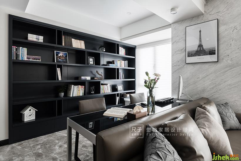 書房,想要兼具工作和休閑功能,深色的書柜平衡著空間色彩,長(zhǎng)書桌足夠滿足兩個(gè)人同時(shí)工作的需求。