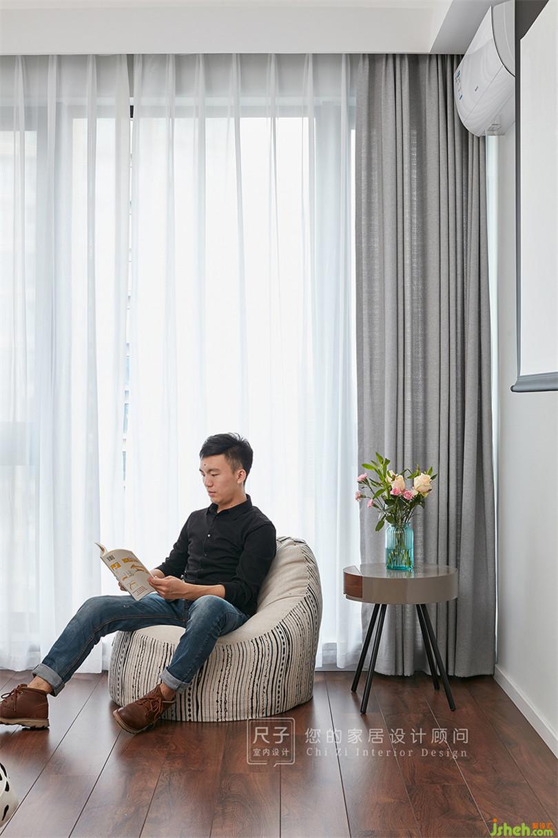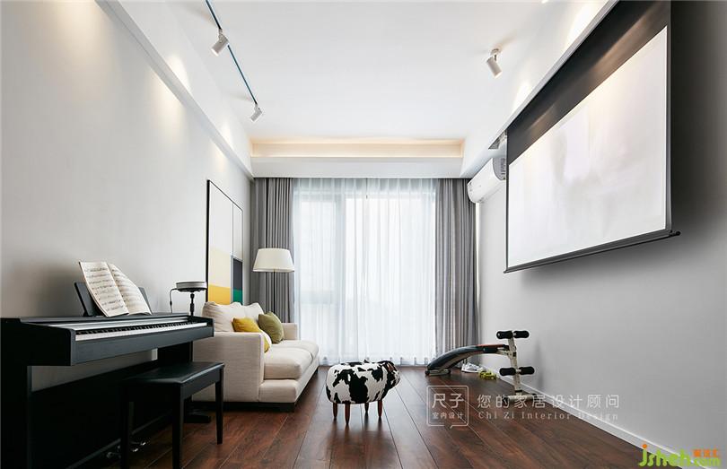 拾階而上,便是開(kāi)放式的多功能房。這里既是業(yè)主的書(shū)房,也是他們的琴室;拉上窗簾,又是一家人理想的影視廳。