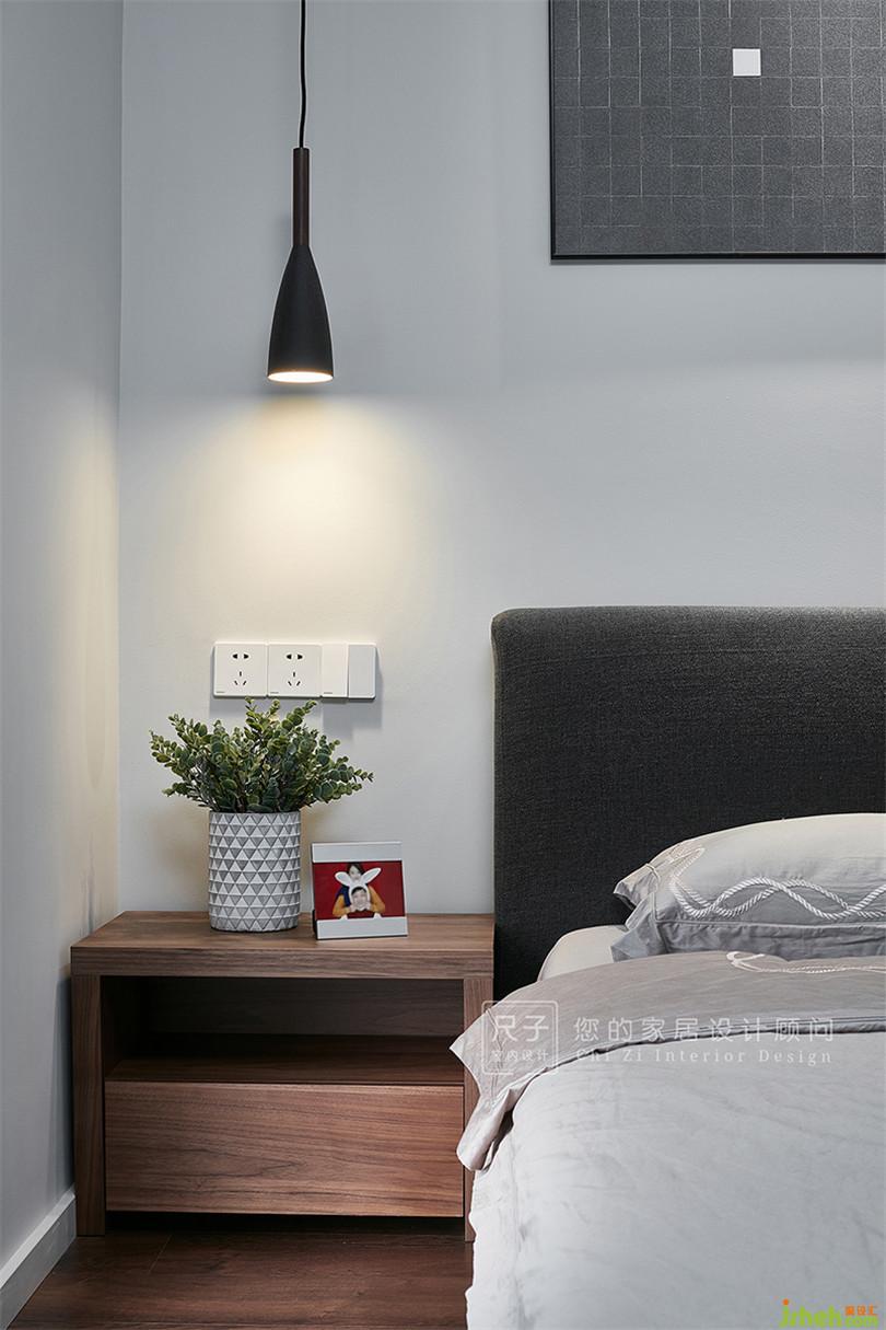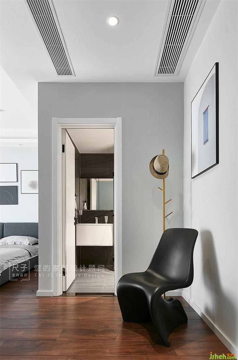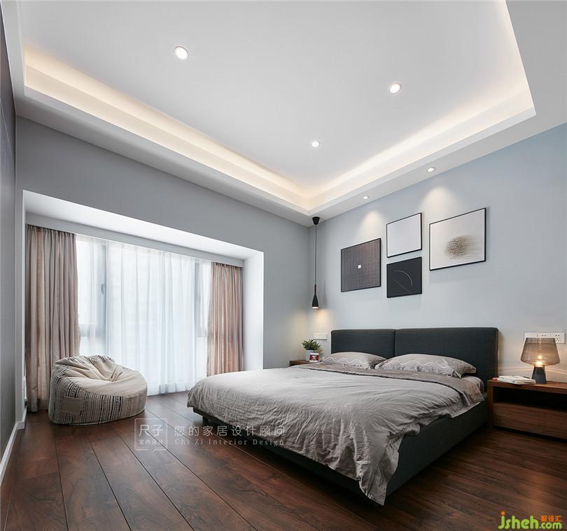 主臥米色、灰色等中性色渲染了寧靜安逸的空間氣氛,落地窗讓室內(nèi)采光極佳,也能眺望城市遠(yuǎn)景。