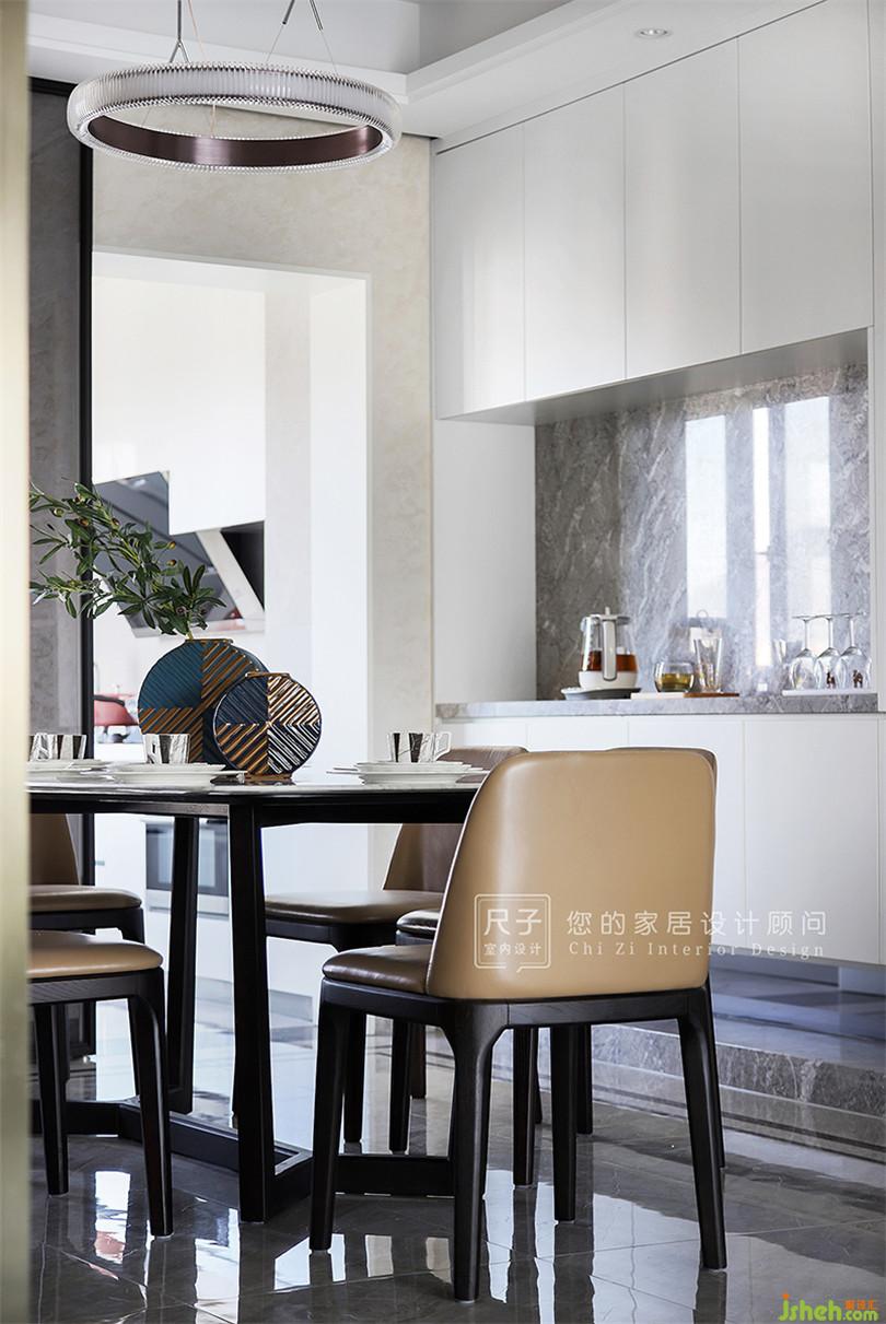 餐廳背景與沙發(fā)背景墻采用同色的硬包,讓空間視覺連貫的同時(shí)又更加柔和。