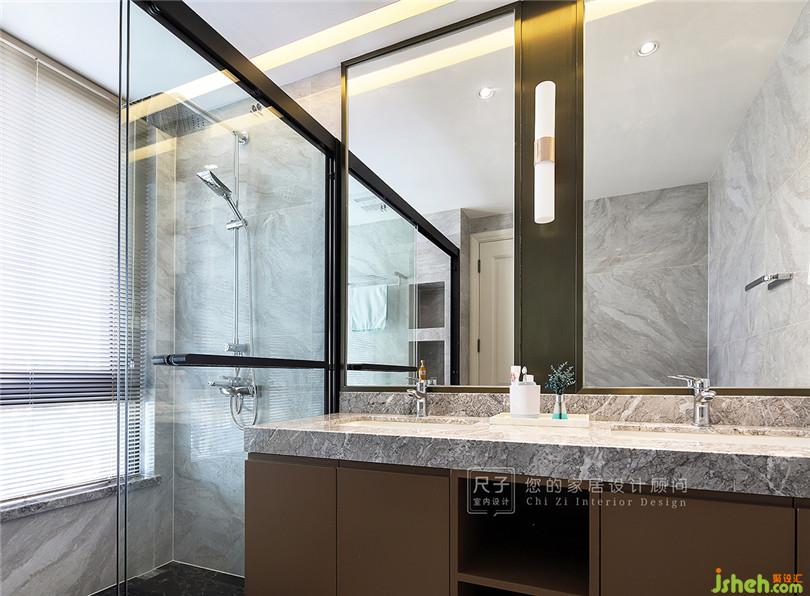 香檳金柜體,結(jié)合大理石臺(tái)面,打造硬朗時(shí)尚的洗浴空間。