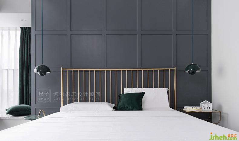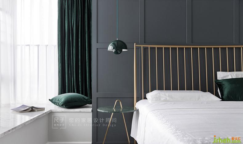 主臥背景墻延續(xù)著客廳的基調(diào),時尚的墨綠軟裝與黃銅色的鐵藝床頭,給空間帶來復(fù)古高貴的氣質(zhì)。深圳設(shè)計公司
