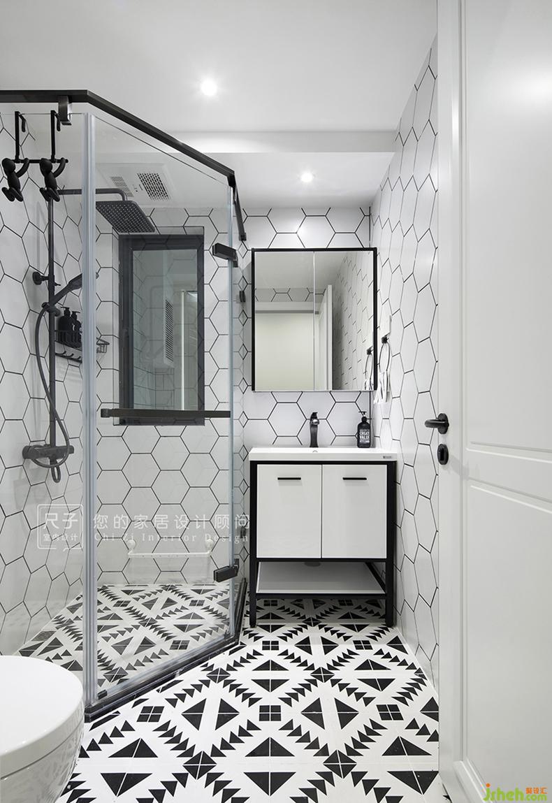 六角磚與小花磚打造高顏值的洗浴空間。