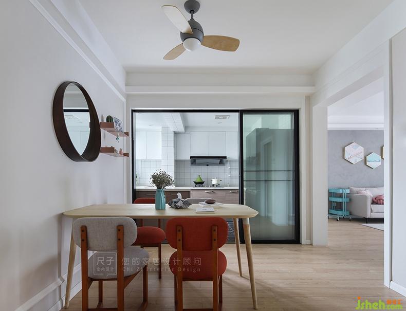 玄關(guān)還是客餐廳的過渡地帶,右轉(zhuǎn)過門洞便是這個(gè)家的餐廳區(qū)域。黑框+玻璃的推拉門,除了讓餐廚功能布局分割更加明確,也讓室內(nèi)更顯時(shí)尚敞亮。
