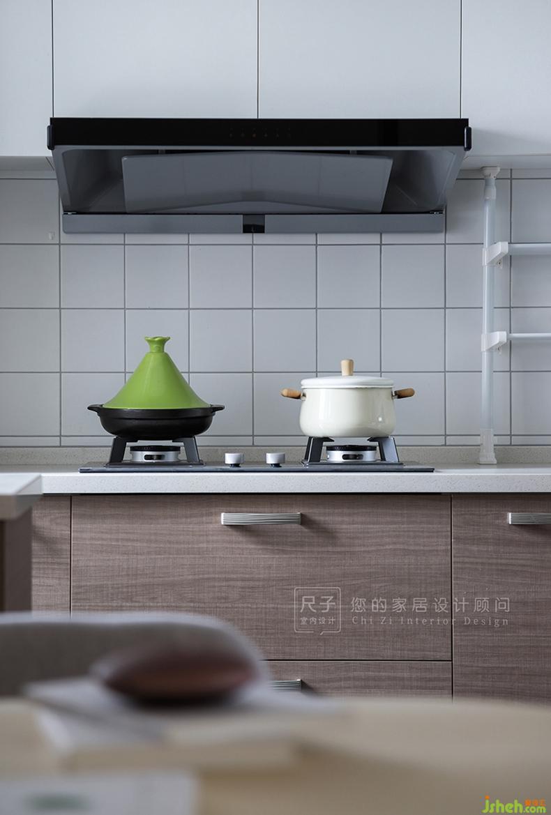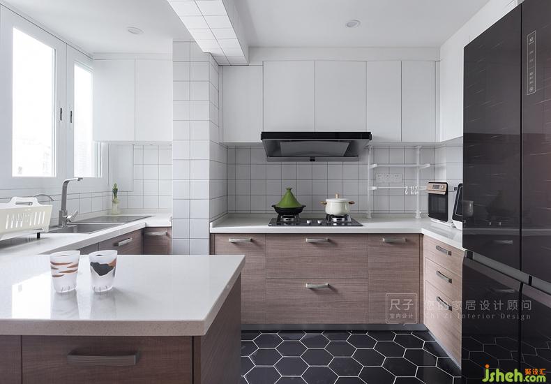 木的溫潤與黑白的干練,構(gòu)成了清爽的廚房空間。沿推拉門一側(cè)做小吧臺(tái)設(shè)計(jì),這一塊是實(shí)用的備餐區(qū)。