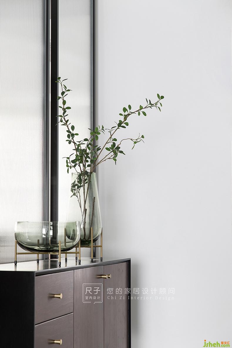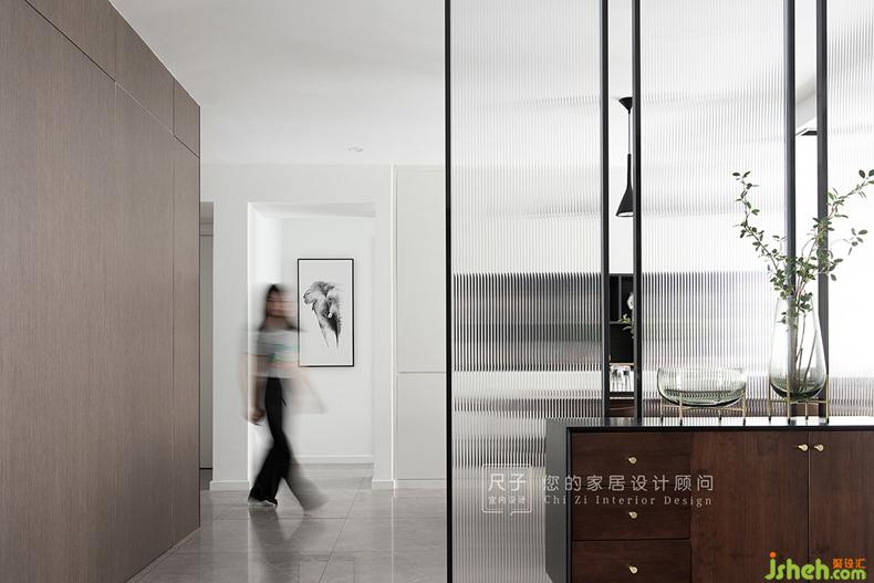 長虹玻璃與胡桃木色矮柜構(gòu)成這個家的入戶端景。深圳設(shè)計公司