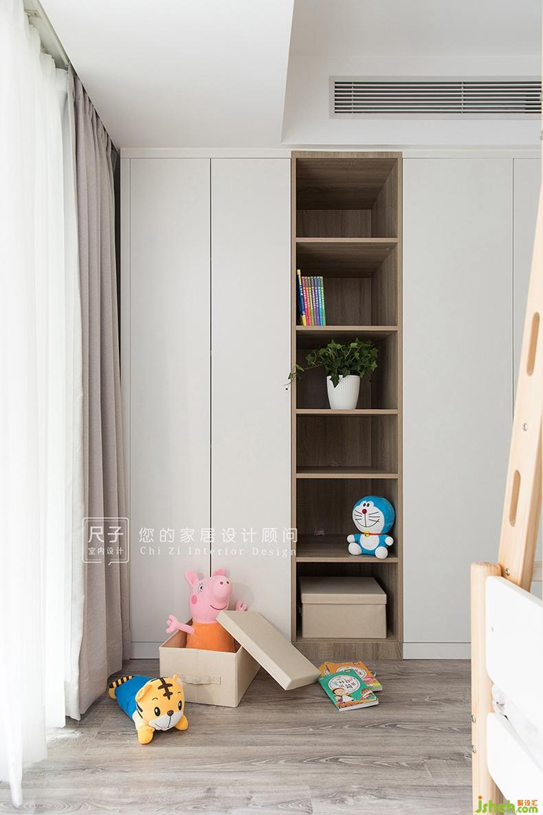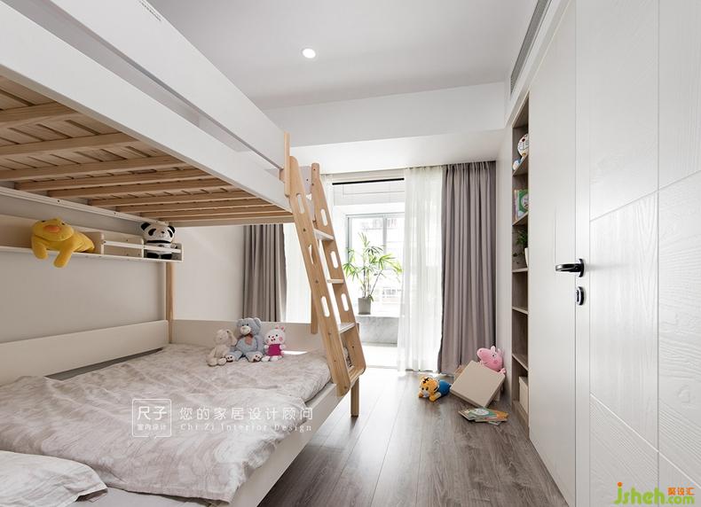 小孩房以上下床設計實現(xiàn),整體色調(diào)清雅,給孩子營造一個安靜舒適的睡眠空間。