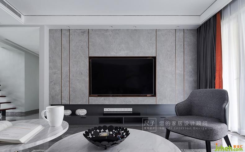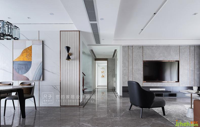 香檳金線條將灰色石材電視背景墻分割為對(duì)稱格局,縱向紋路也與餐廳一側(cè)的硬包背景有了聯(lián)動(dòng)。深圳設(shè)計(jì)公司