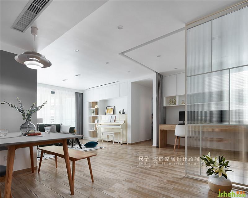 由于工作原因,夫妻二人免不了需要在家辦公,D小姐希望能有一間書(shū)房。我們以拉簾+長(zhǎng)虹玻璃半隔斷進(jìn)行巧妙的功能分區(qū),打造客餐廳、書(shū)房一體的開(kāi)放式格局。室內(nèi)設(shè)計(jì)師
