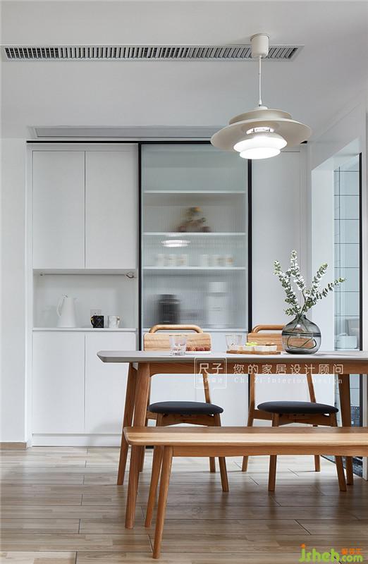 進(jìn)門(mén)左側(cè)就是這個(gè)家的餐廳區(qū)域,清雅的淺木色餐桌椅營(yíng)造溫馨的用餐氛圍;餐邊柜長(zhǎng)虹玻璃移門(mén)給簡(jiǎn)單的場(chǎng)景帶來(lái)朦朧變化的美感。