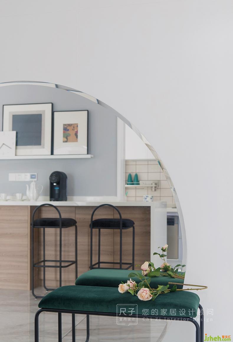 一面1.7*1.2m的圓弧穿衣鏡弱化玄關(guān)空間局促感,同時也讓來訪者從鏡面便可隱約窺見這個家的面貌。