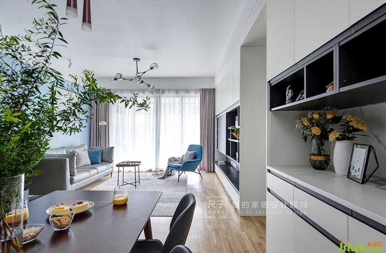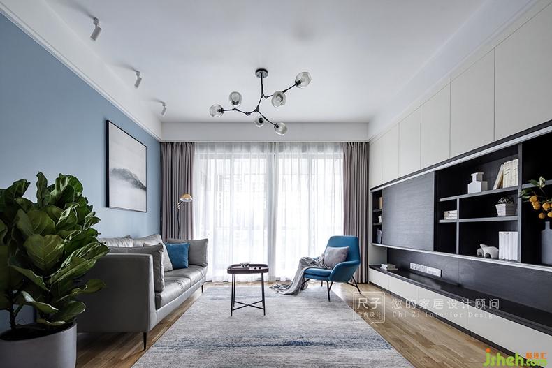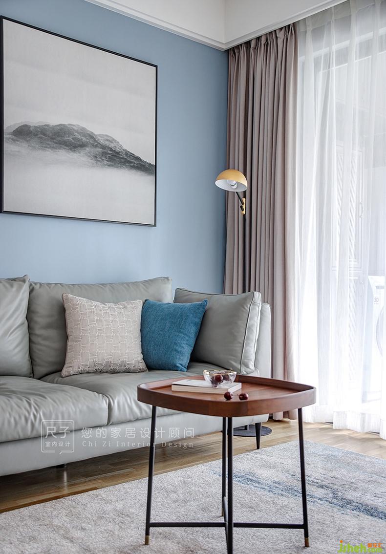 從餐廳延伸過來的墻面過長,如果處理為統(tǒng)一的灰色墻面,難免顯得單調(diào);我們以簡單墻漆分色設(shè)計將業(yè)主喜愛的藍(lán)色應(yīng)用到客廳;黑白灰的冷靜空間,有了家的溫馨的暖意。